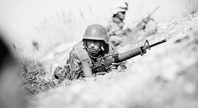 2月19日,在阿南部赫爾曼德省馬爾賈地區(qū),阿富汗士兵與美軍士兵在一次軍事行動(dòng)中臥倒隱蔽。新華社發(fā)