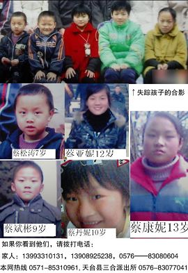 20日上午10點左右,有人給蔡修明的弟媳打來電話,說在三門縣嶺口見過5個孩子,可蔡家人到嶺口未見孩子的蹤影。這時,從嶺口發(fā)往寧海桑洲的一位司機說看到過5個小孩乘中巴車已到寧海。蔡家親戚趕往當?shù)嘏沙鏊{(diào)取了當時的監(jiān)控錄像,但錄像比較模糊,不能確定那就是走失的蔡家姐弟。