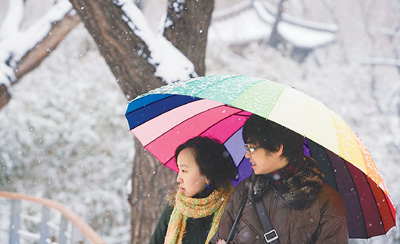 3月14日,北京飄起雪花,一對(duì)情侶在雪中散步。吳家翔攝 (人民圖片)