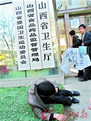 昨日下午,數(shù)名來(lái)自山西各地的家長(zhǎng)來(lái)到山西省衛(wèi)生廳門(mén)口,希望衛(wèi)生廳能為他們孩子死亡或病殘的原因給出解釋。不過(guò),在衛(wèi)生廳會(huì)議室等待了一個(gè)半小時(shí),相關(guān)領(lǐng)導(dǎo)也沒(méi)有和他們見(jiàn)面。