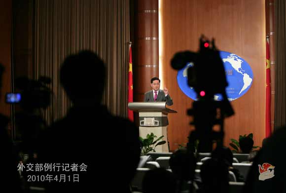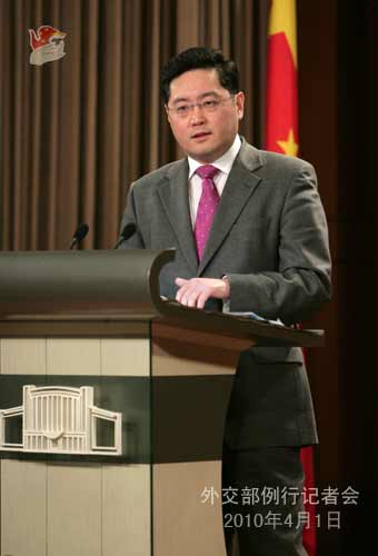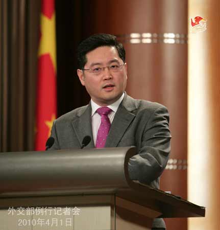 人民網(wǎng)北京4月1日電 據(jù)外交部網(wǎng)站消息,2010年4月1日,外交部發(fā)言人秦剛舉行例行記者會(huì)。答問(wèn)如下。