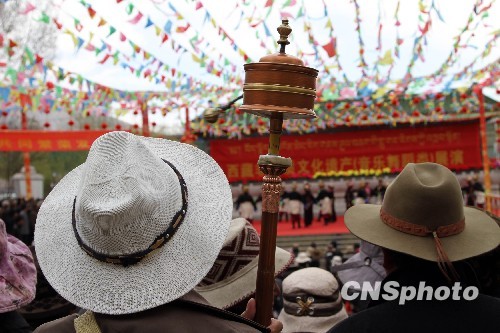 4月2日,西藏拉薩宗角祿康公園上演了一場(chǎng)精彩的非物質(zhì)文化遺產(chǎn)展演。此次活動(dòng)是西藏非物質(zhì)文化遺產(chǎn)走進(jìn)民間的重要嘗試。展演節(jié)目集中在音樂(lè)舞蹈類,包括了昌果卓舞(腰鼓舞)、堆諧、芒康弦子、昌都鍋莊、嘎爾魯(宮廷樂(lè)舞)等,精彩的表演博得觀眾掌聲不斷。圖為觀眾一邊轉(zhuǎn)經(jīng),一邊看演出。 中新社發(fā) 徐長(zhǎng)安 攝