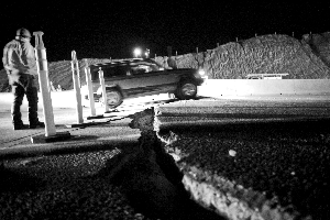 4月4日,在墨西哥下加利福尼亞州,市政人員查看墨西卡利和蒂華納之間道路上的裂縫。新華社發(fā)