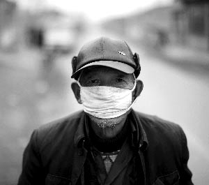 2010年3月31日,內(nèi)蒙古烏蘭察布市興和縣店子鎮(zhèn),村莊里生病的老人戴著口罩在村中慢走,白色的口罩上留著黃色沙土的痕跡。