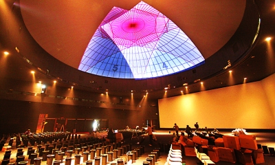 上完臺階,游客首先搭乖電梯來到49米的最上層。這是展館最高、最大的展層,也是核心展示層“東方足跡”。一個超常規(guī)的電影廳是這層的點睛之筆,這里放映的是一部長達8分鐘的“微型史詩電影”,詩意地展現(xiàn)了改革開放30年來中國在城市化建設中所作的努力和成就。