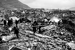 昨日,玉樹結(jié)古鎮(zhèn)的災(zāi)民們正在廢墟上收拾木料,為重建做準(zhǔn)備。 本報(bào)記者 趙亢 攝