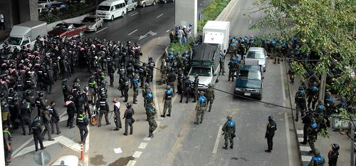 為阻止“紅衫軍”北上,泰國士兵鳴槍示警,并向示威者發(fā)射催淚瓦斯。雙方?jīng)_突致死1名士兵,另有18人受傷。
