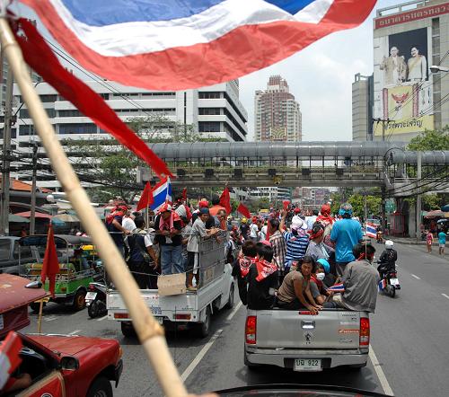 美聯(lián)社報道,“紅衫軍”持續(xù)數(shù)周的示威游行致曼谷幾大商業(yè)區(qū)幾近陷入“癱瘓”,而“紅衫軍”28日宣布將擴(kuò)大示威范圍。28日下午,約1000名“紅衫軍”成員駕駛摩托車與皮卡車沿曼谷廊曼機(jī)場亞洲一號高速公路向曼谷北郊挺進(jìn)。