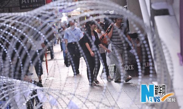4月29日,在泰國首都曼谷市中心的紅衫軍宿營地點(diǎn)附近,路人經(jīng)過軍警設(shè)置的鐵絲網(wǎng)。泰國總理阿披實(shí)4月30日說,政府將采取更加嚴(yán)厲的措施,阻止“紅衫軍”隨意出入集會地點(diǎn)曼谷市中心拉差巴頌路口。 新華社/法新