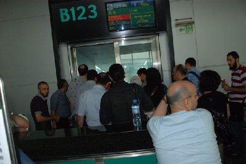 這個(gè)登機(jī)口,旅客正在跟機(jī)場人員爭吵。
