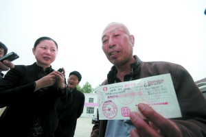 13日上午,趙作海獲得國家賠償和生活補助共65萬元的支票。趙作海表示,獲得的賠償將用來給兒子蓋房,娶媳婦。