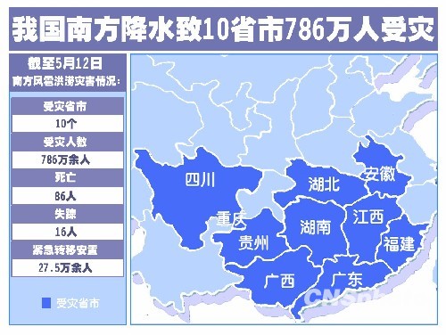 新聞圖表:中國南方強降水致10省市786萬人受災(zāi) 中新社發(fā) 趙乃育 攝
