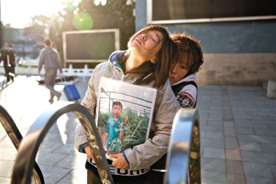昨日,“小粽子”的家人捧著他的照片站在校門口。10月23日,“小粽子”因在玩耍時弄傷同學(xué)被罰站,回家后跳樓身亡。新京報記者周崗峰攝