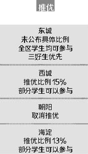 雖然市級教育主管部門對升學(xué)政策有著原則性的要求,但各個(gè)區(qū)縣的升學(xué)政策又有著各自的獨(dú)特性和差異性,加之發(fā)布的時(shí)間不統(tǒng)一,文件透明度不一致,讓極度關(guān)心此事的家長,往往看得眼花繚亂,最終還是一頭霧水。為此,北京青年報(bào)記者就四大區(qū)的升學(xué)政策進(jìn)行了綜合梳理,就讀者最為關(guān)心的教育公正公開透明指標(biāo)進(jìn)行比較,試圖描繪出一幅縮略圖,以此為標(biāo)尺,衡量哪個(gè)區(qū)的改革動(dòng)作最大、升學(xué)政策最公平、教育資源最均衡、政策最透明……