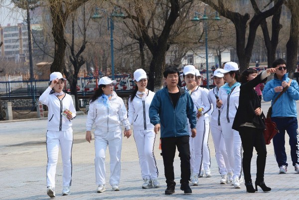 2015年4月15日,吉林省吉林市,一批來自北朝鮮的女留學(xué)生和來中國勞務(wù)的女義工們共同走進(jìn)金日成母校吉林毓文中學(xué)參觀學(xué)習(xí),又游覽了吉林市著名的北山風(fēng)景區(qū)風(fēng)光,并集體合影留念。圖為負(fù)責(zé)老師和留學(xué)生們走在景區(qū)街頭。