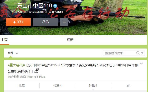 華西都市報(bào)訊(記者 丁偉) 16日下午2時(shí)20分,樂山市公安局市中區(qū)分局官方微博“樂山市中區(qū)110”宣布:樂山市市中區(qū)“2015.4.15”故意殺人案犯罪嫌疑人米陜杰已于4月16日中午被公安機(jī)關(guān)抓獲。