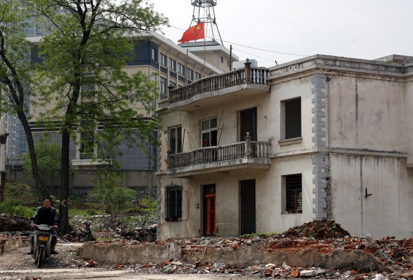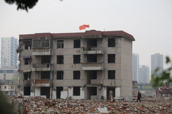 圖為拆遷地一幢屋頂上插著一面五星紅旗。