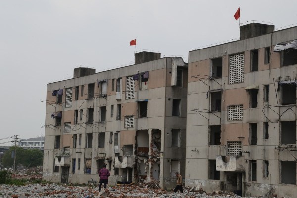 2015年4月20日,在安徽省合肥市銅陵南路與淝河路交口附近的一片拆遷地上,有多幢居民樓頂上插著五星紅旗,隨風(fēng)飄揚(yáng),格外引人注目。" />