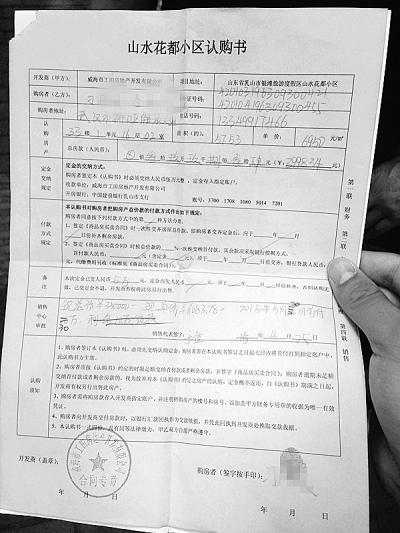易總監(jiān)說,該辦事處并不負責房屋銷售工作,只是協(xié)助開發(fā)商在各省市進行宣傳推廣,并組織看房人員赴威海實地考察。如果顧客一定要退房退款,只能去威海解決!拔覀儧]有強迫任何一個人買房,按照認購書上的約定來說,定金是不予退還的,現在一點辦法也沒有。”易總監(jiān)反復強調,銀灘山水花都小區(qū)五證齊全,房屋質量也沒問題,很多人付完全款后,一周就能拿到兩證。