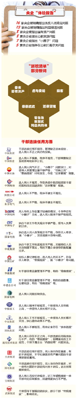 2014年中央巡視組第三輪巡視,覆蓋了包括8家央企在內(nèi)的13家被巡視單位,在8家央企中,有7家存在選人用人問題,中國(guó)聯(lián)通、華電集團(tuán)、東風(fēng)公司和南方航空被點(diǎn)名存在干部“帶病提拔”問題。