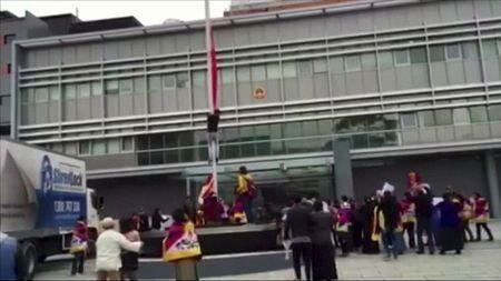 中國駐悉尼總領館副總領事湯瑛說,22日中午,悉尼“藏青會”糾集60多人在總領館門前示威。下午1時15分許,示威人群中的30余人乘隙突破澳大利亞警方設置的防線,沖入總領館前院,向主樓玻璃門沖撞,并投擲石塊。當天館區(qū)內國旗因向萬里同志致哀處于降半旗狀態(tài),一些“藏獨”分子借機扯下了國旗。
