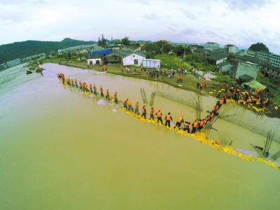 浙江省溫州市鰲江流域平陽縣麻步段,軍民在堤上合力封堵決口。