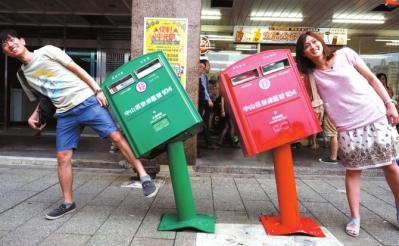 臺(tái)風(fēng)過后,市民與被刮歪的郵箱合影。