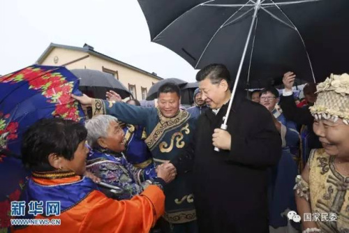 兩個月后,黑龍江八岔赫哲族鄉(xiāng)八岔村雨淅淅瀝瀝下個不停,習近來到烏蘇里江畔親切看望赫哲族群眾。