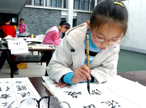 青少年書法爰好者揮毫?xí)鴮憽短m亭集序》。 中新社發(fā) 袁云 攝