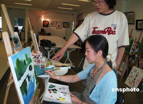 學(xué)用丹青妙筆“畫(huà)說(shuō)”自己的上海見(jiàn)聞,已成為上海眾多臺(tái)商太太的時(shí)髦享受之一。由女性臺(tái)胞社團(tuán)提供的權(quán)威統(tǒng)計(jì)稱(chēng),在上海地區(qū)近三十萬(wàn)臺(tái)胞中,臺(tái)商太太已占相當(dāng)比例。如今在位于上海虹橋地區(qū)的幾處私人畫(huà)室和“創(chuàng)意會(huì)所”里,就有上百名臺(tái)商太太學(xué)員。圖為在上海西郊一處畫(huà)坊,臺(tái)商太太正在拜師學(xué)畫(huà),將自己上海新家的“后花園”搬上油畫(huà)板。 中新社發(fā) 許曉青 攝