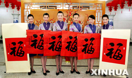 資料圖片:2006年1月24日,廈門航空公司的6名空姐展示“福”字。1月25日,2006年兩岸春節(jié)包機(jī)廈航首航班機(jī)抵達(dá)臺灣后,這些“!弊謱⒈毁浰徒o臺灣同行。新華社發(fā)(陳理杰 攝)