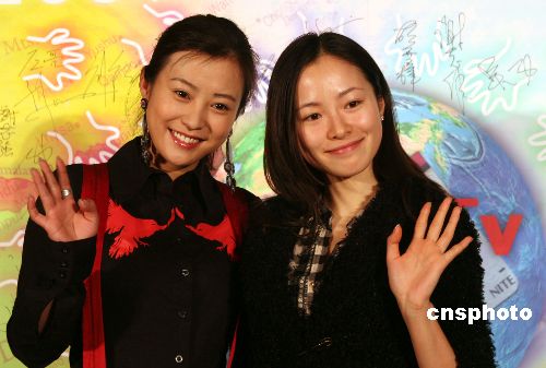 十二月四日,大陸知名演員郝蕾(左)、江一燕在臺北參加“二00七臺灣國際影視創(chuàng)投會”開幕式,成為媒體競相拍照的焦點(diǎn)。 中新社發(fā) 董會峰 攝