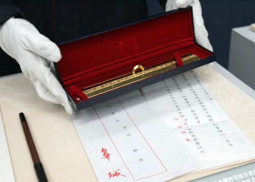 在汪老生前收藏的辜振甫夫婦金婚紀念品“龍鳳金鎮(zhèn)紙”前,一對臺胞老夫婦合影留念。他們說,金鎮(zhèn)紙也寓意著“兩岸一家親”。幾位年輕的臺商太太則希望,當年見證汪辜會晤的大陸知名記者為眾人簽名留念。