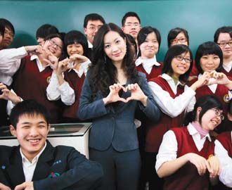 深圳航空臺(tái)灣籍空姐座艙長(zhǎng)曾怡綸(中),昨天重返母;ㄉ徦木S高中,與學(xué)弟妹分享奮斗的故事,還用雙手比出愛心的手勢(shì)。(臺(tái)灣《聯(lián)合報(bào)》圖)