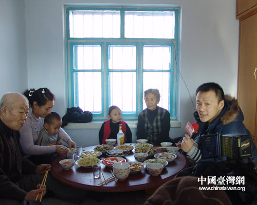 記者們到達(dá)時,王慶榮一家人正在吃午飯。臺灣年代電視臺的記者陳立國經(jīng)不住火炕的溫暖,地道的東北農(nóng)家菜的吸引,爬上火炕與大家坐到一起。