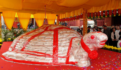 2月22日,福建泉州天后宮舉行傳統(tǒng)民俗“平安乞龜”揭彩儀式。當日,來自海峽兩岸的300多人參加了“平安乞龜”揭彩儀式,這是福建泉州天后宮連續(xù)第二年與臺灣澎湖天后宮聯(lián)合舉辦“乞龜”元宵祈福活動。由1萬公斤大米堆砌而成的“大米龜”頭高1米,背高1.5米,長7米,寬近5米!逼螨敗笆桥旌(jié)的特色民俗。新華社發(fā)(顏財斌 攝)