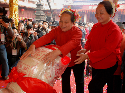 2月22日,福建泉州天后宮舉行傳統(tǒng)民俗“平安乞龜”揭彩儀式,兩名婦女撫摸“大米龜”,祈求平安吉祥。新華社發(fā)(顏財斌 攝)
