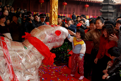 2月22日,福建泉州天后宮舉行傳統(tǒng)民俗“平安乞龜”揭彩儀式,一名小朋友撫摸“大米龜”。新華社發(fā)(顏財斌 攝)