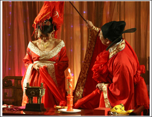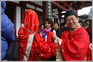 入鄉(xiāng)隨俗,一切按大唐婚典的儀式來操辦,“下馬射箭,驅(qū)邪安康!”司儀小郭高聲道。新郎下馬,彎弓搭箭,向雪中連射3箭。然后新郎來到花轎前,掀開紅布簾將新娘迎了出來,倆人手牽著紅綢緩緩步入婚禮的殿堂。新郎與新娘跨過象征著日子紅紅火火的“火盆”,接著司儀遞給新郎一桿代表稱心如意的秤,新郎用秤桿輕輕挑起新娘的紅蓋頭。美麗的新娘,讓樂得合不攏嘴的新郎,當著上百親朋好友高聲連喊“滿意、滿意、滿意”!