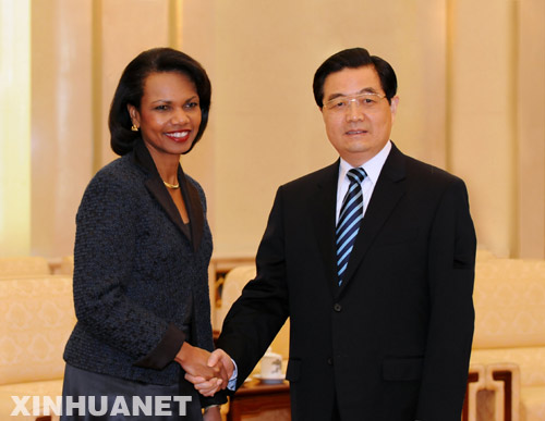 2月26日,國家主席胡錦濤在北京人民大會堂會見美國國務(wù)卿賴斯。 新華社記者李學(xué)仁攝
