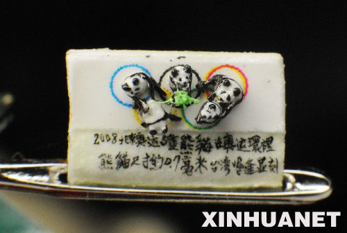 臺灣著名雕刻藝人陳逢顯用了6個月的時間,用樹脂為材料,在針鼻大的地方,成功雕刻出兩件熊貓與奧運相結(jié)合的微雕作品,以此表達他盼望北京成功舉辦奧運會的心情。圖為陳逢顯先生雕刻的5只熊貓與奧運五環(huán)旗,熊貓尺寸為0.7毫米,作品下方為針鼻(3月18日攝)。 新華社記者 陳樹根 攝