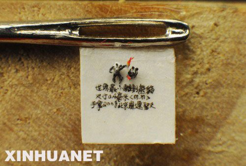 臺灣著名雕刻藝人陳逢顯用了6個月的時間,用樹脂為材料,在針鼻大的地方,成功雕刻出兩件熊貓與奧運相結(jié)合的微雕作品,以此表達他盼望北京成功舉辦奧運會的心情。圖為陳逢顯先生雕刻的手拿奧運圣火的熊貓,熊貓尺寸為0.4毫米,作品上方為針鼻(3月18日攝)。 新華社記者 陳樹根 攝