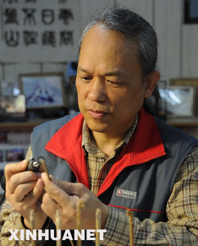 臺灣著名雕刻藝人陳逢顯用了6個月的時間,用樹脂為材料,在針鼻大的地方,成功雕刻出兩件熊貓與奧運相結(jié)合的微雕作品,以此表達他盼望北京成功舉辦奧運會的心情。圖為正在雕刻的52歲的陳逢顯先生(3月18日攝)。 新華社記者 陳樹根 攝