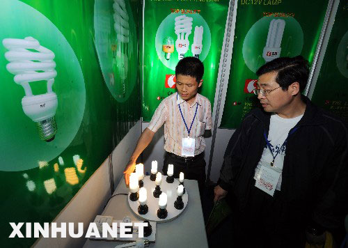4月8日,一位澳大利亞客商(左)對臺交會上展出的節(jié)能燈產(chǎn)品產(chǎn)生濃厚興趣。 當(dāng)日,第十二屆臺交會在廈門國際會展中心舉行,兩岸參展企業(yè)展出的節(jié)能照明、太陽能應(yīng)用等產(chǎn)品不僅增添了本屆臺交會節(jié)能環(huán)保的特色,同時(shí)受到廣大客商的青睞。 新華社記者姜克紅攝