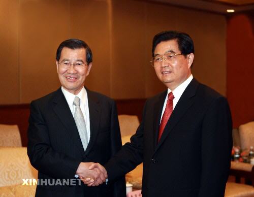 4月12日,中共中央總書記胡錦濤在海南省博鰲會見蕭萬長先生率領(lǐng)的臺灣兩岸共同市場基金會代表團一行。 新華社記者鞠鵬攝