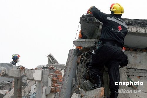 來自臺灣的紅十字救援隊,十七日進入四川綿竹市漢旺鎮(zhèn)展開搜救工作,圖為隊員們爬上廢墟頂部探測。 中新社發(fā) 齊彬 攝