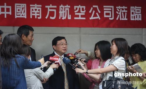 六月十七日下午,中國(guó)南方航空副總經(jīng)理何宗凱(中立者)一行來到臺(tái)北“中華航空”的總部,與華航進(jìn)行業(yè)務(wù)磋商,受到華航行銷副總經(jīng)理謝世謙(左二)的歡迎并被臺(tái)灣記者包圍采訪。為盡快落實(shí)兩岸兩會(huì)簽署的兩岸周末包機(jī)協(xié)議,中國(guó)國(guó)際航空副總張?zhí)m,東方航空總經(jīng)理曹健雄都已抵達(dá)臺(tái)北與臺(tái)灣的同行進(jìn)行業(yè)務(wù)磋商。 中新社發(fā) 耿軍 攝