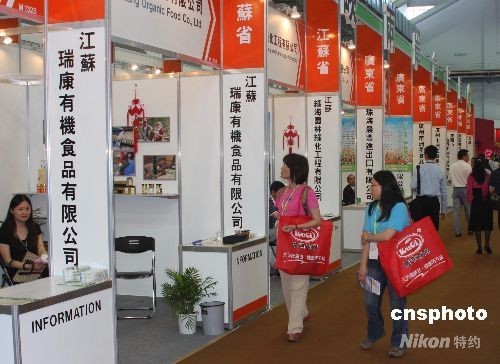 展會(huì)設(shè)立了大陸展區(qū),三十九家大陸廠商前來參展。武漢市漢口精武食品公司的攤位在推銷袋裝“中國鴨脖王”。南京瑞康蜂業(yè)有限公司在介紹有機(jī)蜂王漿!爸胁琛惫静贾玫牡恼刮灰俗⒛浚瑹粝湫涯康赜吵鲆痪虐肆暧跻聋惿自L華時(shí),云南省長和志強(qiáng)向女王贈(zèng)送“中茶”產(chǎn)品的照片,展柜中的各種普洱茶吸引了許多臺(tái)灣觀眾駐足。