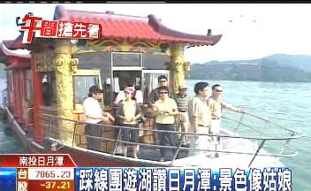 據(jù)臺灣TVBS報道,大陸踩線團到日月潭觀光,當(dāng)然不會錯過搭船游湖這個行程。2艘豪華游艇,早就在湖邊等候,等待踩線團成員一上船,直奔邵族祖靈地那魯島。