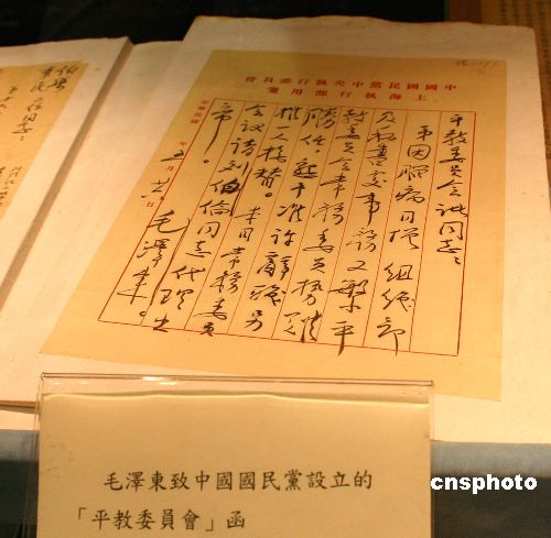 資料圖為毛澤東于1924年5月26日致國民黨設(shè)立的“平教委員會”函。 中新社發(fā) 張量 攝